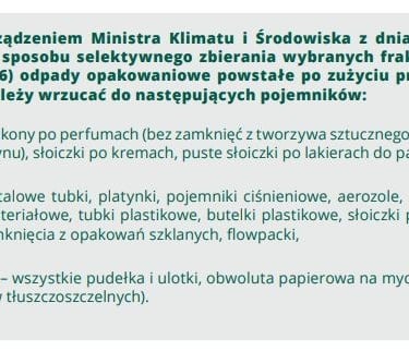 · opróżniamy opakowania do końca, jeśli musimy pozbyć się dużej ilości kosmetyku (np. z powodu przeterminowania), to masy typu krem wyrzucamy do odpadów resztkowych/zmieszanych, masy płynne (szampony, żele, płyny micelarne, toniki) można wylać do kanalizacji, oleje powinny być utylizowane osobno (PSZOK),