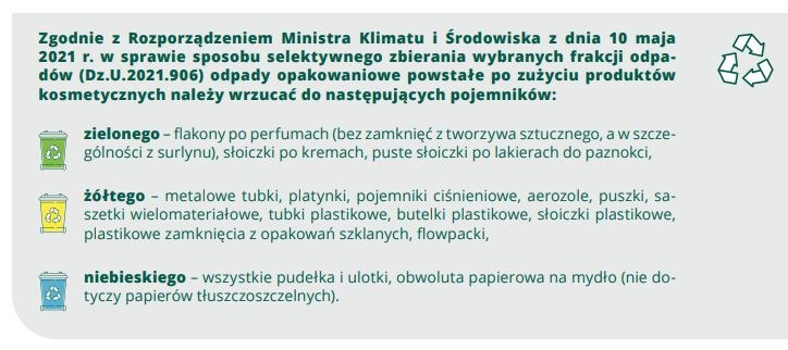 Jeśli my, konsumenci, prawidłowo posegregujemy odpady, zwiększamy ich szansę na poddanie recyklingowi. Niestety mimo obowiązkowego systemu sortowania, jakość tej czynności w wielu przypadkach jest znikoma. Wystarczy przejść się do własnej altany śmietnikowej i krytycznie spojrzeć na to, co ląduje w jakim pojemniku. Wynika to z braku świadomości, edukacji, ale często po prostu lenistwa. Poniżej fragment raportu Rekopolu i Polskiego Związku Przemysłu Kosmetycznego, który ilustruje, gdzie powinno wyrzucać się opakowania po kosmetykach.
