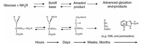 Proces glikacji jest kilkuetapowy i można wyróżnić w niej trzy zasadnicze punkty: tworzenie zasady Schiffa, w wyniku reakcji glukozy (cukru redukującego) z aminokwasami, tworzenie produktów przejściowych i formowanie końcowych AGE. Cząsteczki AGE różnią się strukturą - mogą to być liniowe łańcuchy, formy cykliczne lub usieciowane cząsteczki białek. Większości etapów glikacji towarzyszy pojawianie się wolnych rodników, a więc stres oksydacyjny.