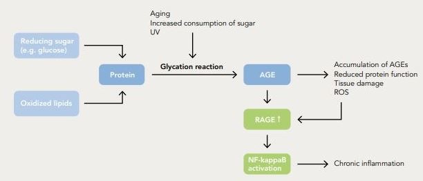 Cząsteczki AGE wykazują także powinowactwo do receptorów (RAGE) występujących na wielu typach komórek. Jeśli dojdzie do połączenia cząsteczka - receptor, aktywowany jest czynnik prozapalny NF-kappaB.