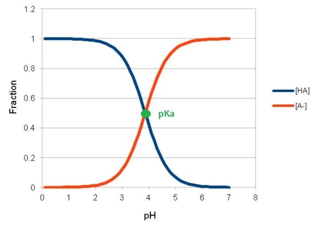 I tak np. dla kwasu mlekowego Ka = 1,4x10-4, co podstawieniu do powyższego równania daje pKa = 3,86, a dla kwasu cytrynowego Ka = 7,4x10-4 -> pKa = 3,13. Czyli kwas cytrynowy jest mocniejszy, niż mlekowy. Stała dysocjacji, niezależnie od tego, czy wyrażona jest zwykłą liczbą czy logarytmem, określa również jaka ilość kwasu jest w formie cząsteczkowej (niezdysocjowanej), a jaka w zdysocjowanej (zjonizowanej). Im mniejsze pKa, tym kwas jest „bardziej kwaśny” – chętniej dysocjuje, a w wyniku tej reakcji powstają jony hydroniowe, które „obniżają pH” (im więcej jonów hydroniowych, tym niższe pH). Kiedy pH jest równe pKa, połowa cząsteczek kwasu jest formie „wolnej”, a połowa – w zdysocjowanej (czyli np. gdy mamy 10% kwas mlekowy w pH 3,86, to 5% kwasu jest w formie wolnej, a 5% - zdysocjowanej). Kiedy pH jest mniejsze, niż pKa, dominuje forma wolna, kiedy pH jest większe niż pKa – zdysocjowana. Popatrzmy na rysunek poglądowy dla kwasu mlekowego (HA oznacza formę wolną, a A- zdysocjowaną). W pH poniżej 3,9 większość kwasu mlekowego będzie w formie wolnej, a powyżej tego pH będzie występowała w postaci zdysocjowanej.