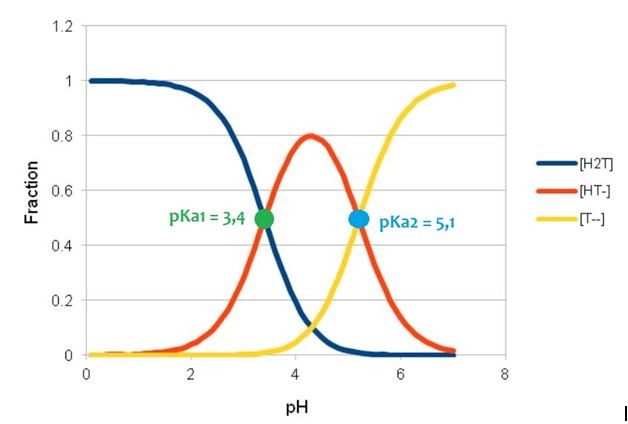 W przypadku kwasów, które zawierają więcej grup zdolnych do dysocjacji, np. kwasu jabłkowego (Malic Acid), sprawa jest jeszcze bardziej skomplikowana, ponieważ mamy dwie stałe dysocjacji pKa1 i pKa2. Na rysunku poniżej pokazano zależność pH i pKa dla kwasu jabłkowego – na żółto zaznaczono w pełni zdysocjowaną formę, na czerwono – w części zdysocjowaną, a na niebiesko – wolną (niezdysocjowaną).