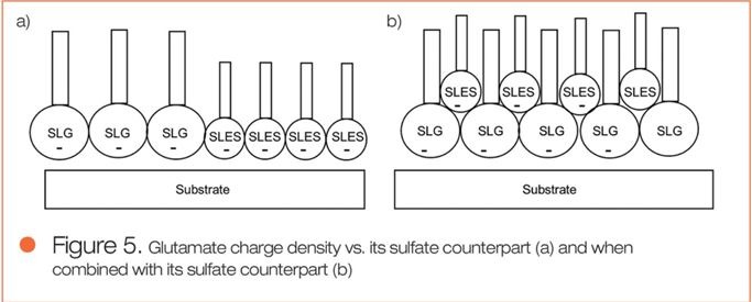 Rzeczą znaną jest, że anionowe detergenty typu SLS mogą penetrować naskórek i powodować podrażnienia. Wynika to m.in. z ich budowy. Surfaktanty zbudowane są z polarnej „głowy” i niepolarnego „ogona”. Im mniejsza „głowa”, tym łatwiej o penetrację skóry. „Głowa” detergentów glutaminowych i alaninowych jest zawsze większa, niż w przypadku SLS. Jeśli dodamy glutaminiany do SLS, zmieni się geometria ułożenia cząsteczek, a produkt będzie nie tylko mniej podrażniał, ale i łatwiej się spłukiwał.