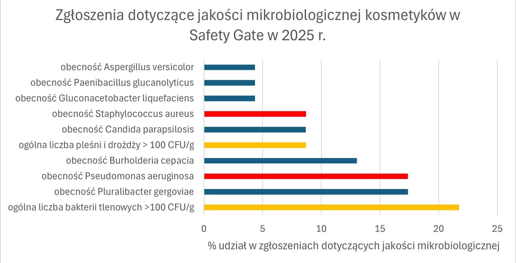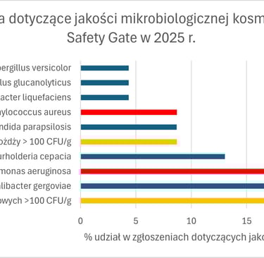Zgłoszenia związane z czystością mikrobiologiczną kosmetyków dotyczyły 1,3% zgłoszeń dla produktów kosmetycznych. Były to zarówno przekroczenia tzw. ogólnej liczby drobnoustrojów (pomarańczowe na wykresie), jak identyfikacje specyficznych szczepów patogennych – na wykresie na czerwono zaznaczono szczepy, które nie mogą być obecne w kosmetykach zgodnie z normami mikrobiologicznymi, na niebiesko – inne niepożądane drobnoustroje.