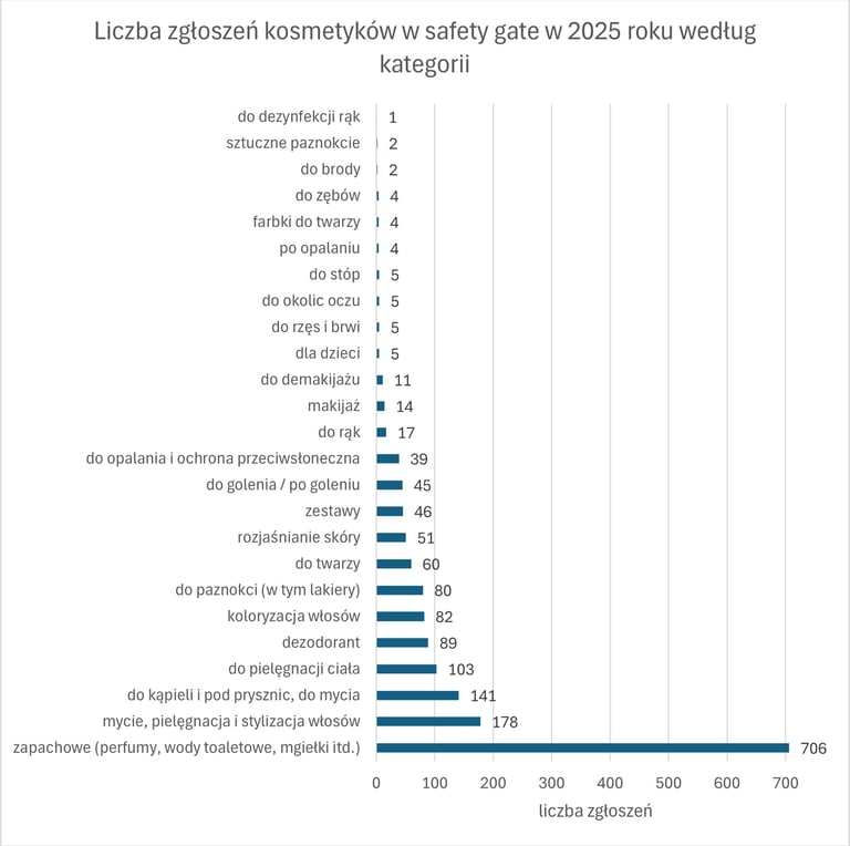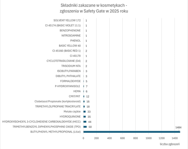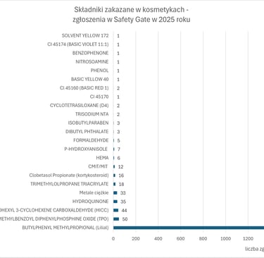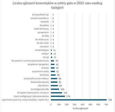 W 2025 roku w Safety Gate opublikowano 4774 alertów, z czego 1707 dotyczyło produktów kosmetycznych (czyli ok. 35%).