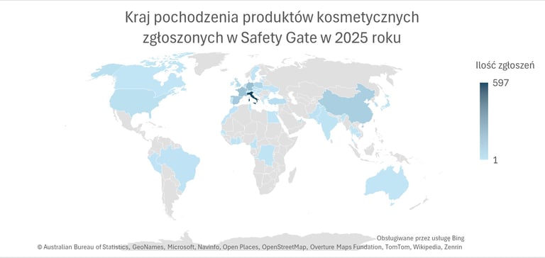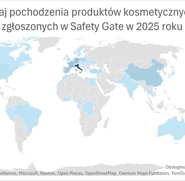 Z kolei biorąc pod uwagę kraj pochodzenia zgłaszanych produktów, to ok. 66% alertów dotyczyło kosmetyków pochodzących z Unii Europejskiej. Włochy zostały także „zwycięzcą” jeśli chodzi o najczęstszy kraj pochodzenia kosmetyków zgłoszonych w 2025 roku – ok. 35% z nich pochodziło właśnie stamtąd. Na kolejnych miejscach uplasowały się: Niemcy (ok. 8%), Francja (ok. 7%), Hiszpania (ok. 6%), Chiny (ok. 5%), Polska (ok. 3,5%). Ponad 15% zgłoszeń nie miało określonego kraju pochodzenia. Poniższa mapa pokazuje, skąd pochodziły zgłoszone kosmetyki.