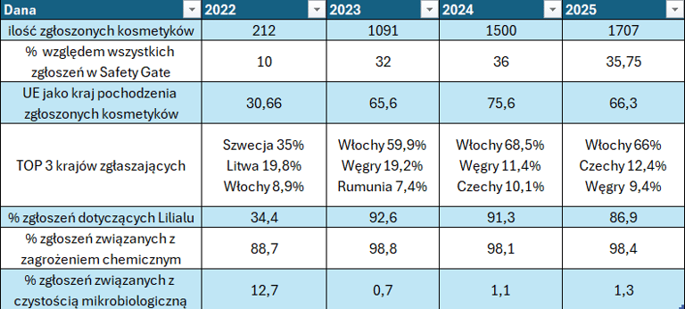 W poniższej tabeli pokazuję kilka parametrów na przestrzeni ostatnich 4 lat. Liczba zgłaszanych kosmetyków rośnie rok do roku i jest to od 3 lat najbardziej liczna kategoria zgłoszeń w Safety Gate. Większość zgłaszanych produktów pochodzi z krajów Unii Europejskiej, a najwięcej alertów do systemu wprowadzają Włosi, Czesi i Węgrzy. W ostatnich latach Lilial stanowił powód ok. 90% zgłoszeń dla kosmetyków, a ok. 98% zgłoszeń kosmetyków związanych jest z zagrożeniem chemicznym (obecnością składników zakazanych lub o ograniczonym stosowaniu).