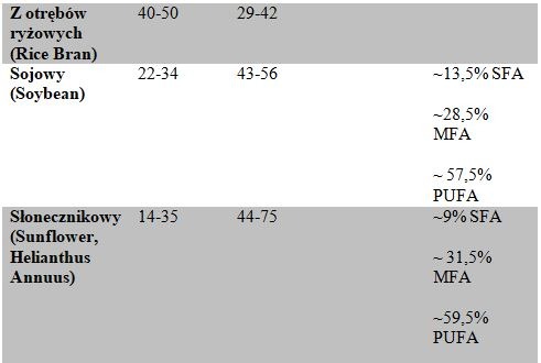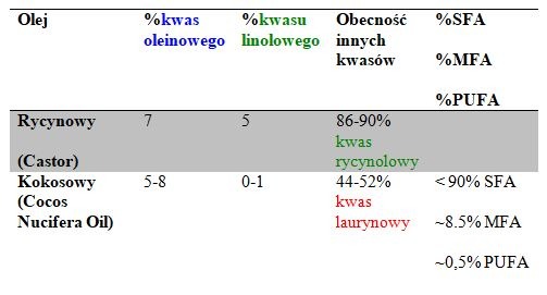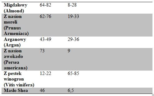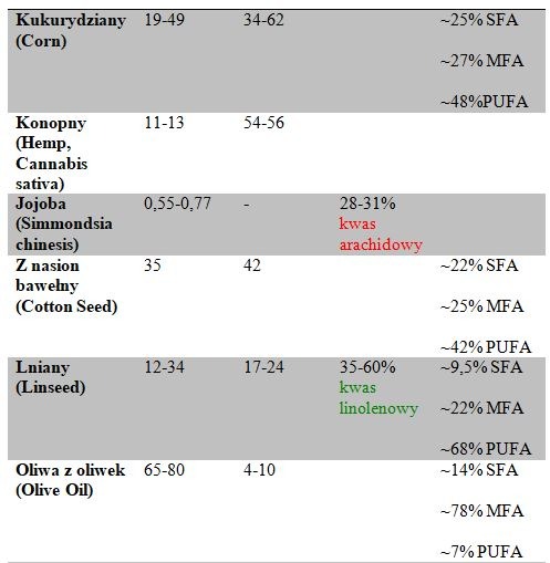 W tabeli poniżej zebraliśmy informacje o składzie kilku najbardziej popularnych olejach roślinnych (dla wielu kwasów są to zakresy, a nie jedna konkretna liczba, a wynika to z faktu zmienności upraw oraz różnych metod pozyskiwania oleju):
