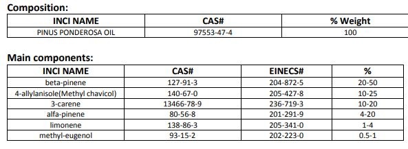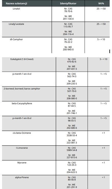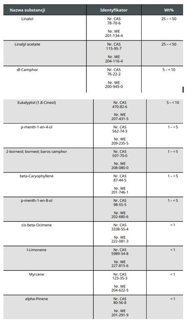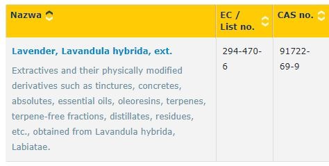 Doskonale wiemy jednak, że taki olejek lub ekstrakt nie jest substancją jednoskładnikową, często również nie wieloskładnikową. Zawartość poszczególnych składników jest związana z miejscem i sposobem uprawy, datą zbioru, przetwórstwem itd. Poniżej pokazuję przykładowy fragment składu olejku lawendowego - jak widać, zawiera on składniki, które również są identyfikowalne (mają własne numery CAS i WE) i występować mogą w szerokim zakresie stężeń. Mimo wiedzy na temat składu substancji, prawnie taki olejek traktuje się całościowo, jako substancję.
