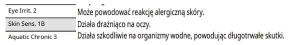 - dla zdrowia człowieka (np. działanie uczulające, działanie drażniące, CMR),