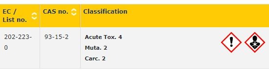 Olejek sosnowy, uznawany za MOCS, zawiera 0,5 - 1% składnika Methyl Eugenol, który sklasyfikowany jest jako Carc 2. B i Muta 2. Zgodnie z zasadami klasyfikacji mieszanin, taki MOCS musi zostać sklasyfikowany w tych klasach zagrożeń (obecnie nie jest on w ten sposób klasyfikowany). Olejek ten jest następnie używany w mieszaninie stanowiącej kompozycję zapachową w ilości 3%. Ponownie cała kompozycja zapachowa musi więc zostać zaklasyfikowana tak samo.