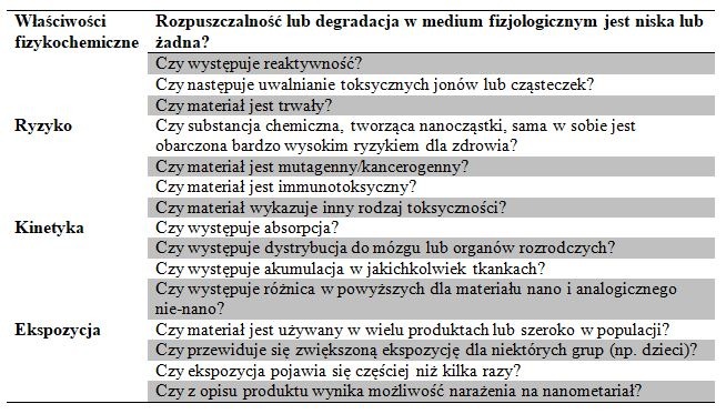 W 2019 roku zaproponowano system punktowy, który mógłby pomóc w ocenie ryzyka, jakie niosą nanocząstki dla zdrowia człowieka. Dla kilku kategorii postawiono pytania, na które można odpowiadać, uzyskując określoną ilość punktów za odpowiedź - TAK (3 pkt), NIE (0 pkt), NIE WIADOMO (1 pkt). Im wyższa suma punktów za odpowiedzi, tym możliwie większe ryzyko dla człowieka.