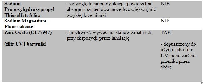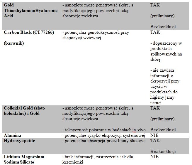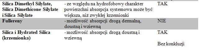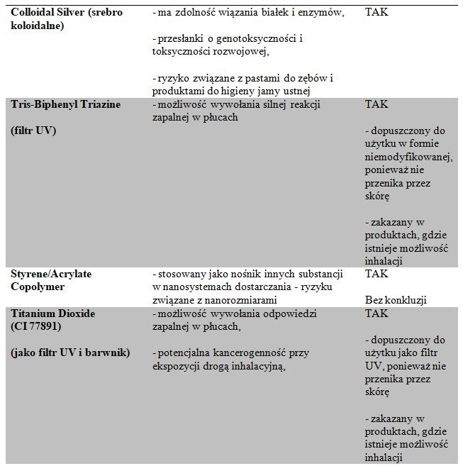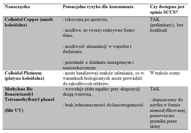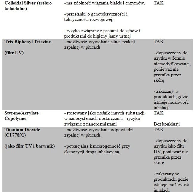 Jak widać, większość opinii jest bez konkluzji z powodu braku wystarczających danych. Najbardziej ryzykowną drogą ekspozycji jest natomiast droga wziewna, stąd nie powinno stosować się nanocząstek w produktach aerozolowych i sprayach.