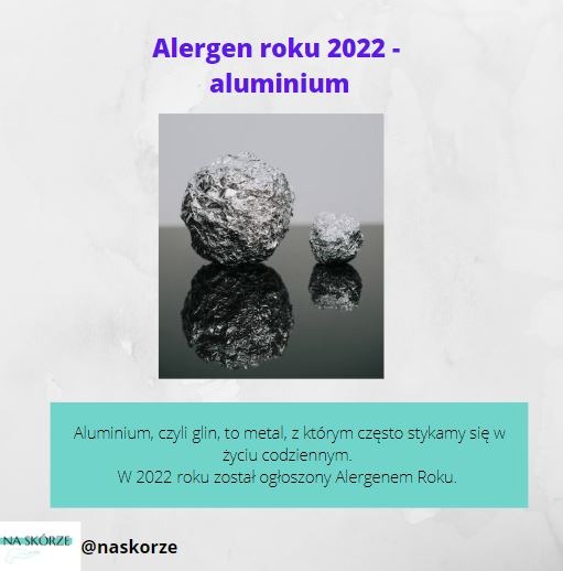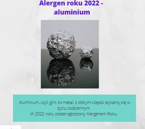 W 2022 roku alergenem roku ogłoszono aluminium. Nie jest to nowy alergen. Glin (aluminium) oraz jego sole są powszechnie obecne w naszym codziennym życiu. Znajdziemy go w opakowaniach, w tym żywności (tacki, foremki, puszki, wieczka, itd.), sprzęcie elektronicznym, kosmetykach (przede wszystkim antyperspirantach, pomadkach do ust, pastach do zębów), lekach, tatuażach, implantach dentystycznych, niektóre szczepionkach jako adjuwanty oraz w immunoterapiach. W przestrzeni publicznej pojawiały się informacje, że aluminium może powodować nowotowory piersi i chorobę Alzhaimera. Jednak w tych sprawach brak jasnych dowodów na to, że może to być wynik zwykłej ekspozycji na aluminium poprzez jego spożycie czy stosowanie kosmetyków. Ze względu na powszechność występowania aluminium i stabilność jego związków, przez długi czas uważano, że nie wywołuje ono alergii. I z jednej strony alergia kontaktowa na elementarny glin jest rzadka, z drugiej - sole aluminium zostały rozpoznane jako znaczący czynnik powodujący kontaktowe zapalanie skóry, szczególnie wśród dzieci. Są trzy główne źródła, z których może wywodzić się aluminium powodujące alergie: szczepionki, immunoterapie oraz antyperspiranty.