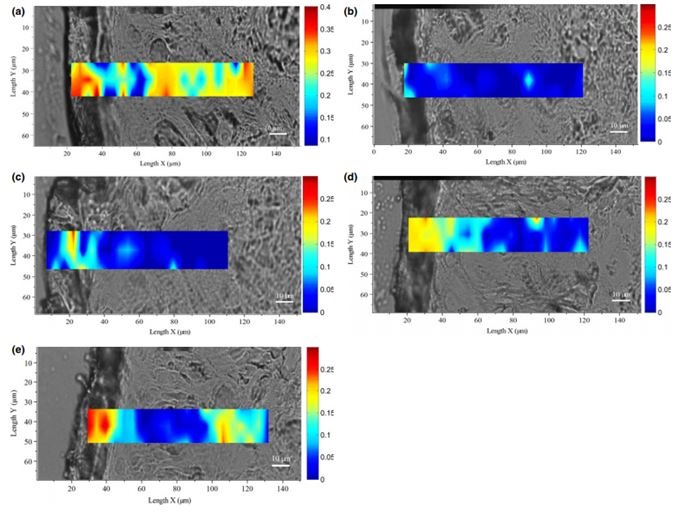 Kwas hialuronowy Kwas hialuronowy to jeden z tych składników, gdzie kwestia przenikania jest sporna. Nawet najmniejszy (ultra niskocząsteczkowy) kwas hialuronowy, dla którego czasem deklaruje się przenikanie do skóry właściwej, ma masę cząsteczkową rzędu kilku kDa, czyli 1000 Da, czyli jest to wartość znacznie przekraczająca 500 Da. Jednak w 2016 roku ukazała się publikacja, w której wykorzystano inną, niż standardowe (stripping test, komora dyfuzyjna in vitro) metodę pomiaru penetracji skórnej, mianowicie spektroskopię Ramana. Wyniki z tego doświadczenia pokazują, że kwas hialuronowy o wielkości 20-50 kDa obecny był na głębokości 100 µm naskórka, podczas gdy HA 1000-1400 kDa pozostawał tylko na powierzchni, a 100-300 kDa na głębokości ok 25 µm. Warstwa rogowa naskóra ma grubość ok. 10-30 µm, a cały naskórek ok. 100 µm. Na rysunku poniżej pokazano wyniki tego eksperymentu - a) kontrola pozytywna - gliceryna, b) kontrola negatywna - woda, c) HA 1000-1400 kDa, d) HA 100-300 kDa, e) HA 20-50 kDa.